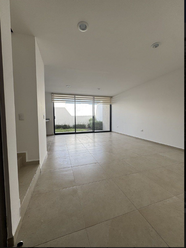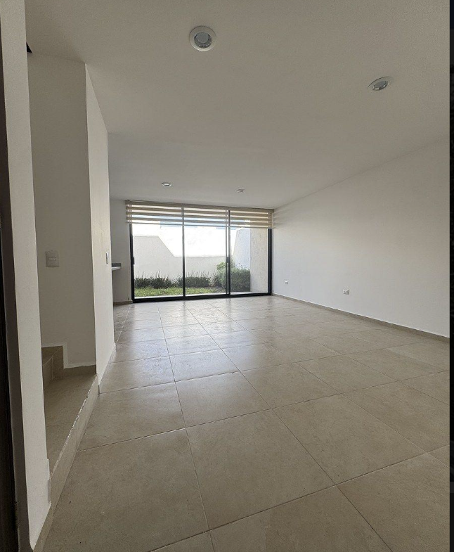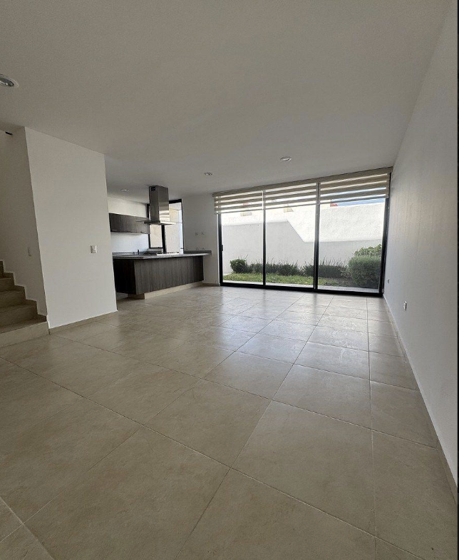 Planta baja: estacionamiento amplio, sala, comedor, cocina equipada con barra de granito, cuarto de lavado, medio baño y jardín