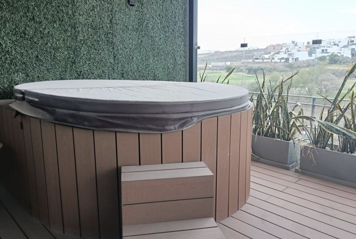Family room con terraza y jacuzzi, baño completo, recámara principal con vestidor, baño y terraza privada.