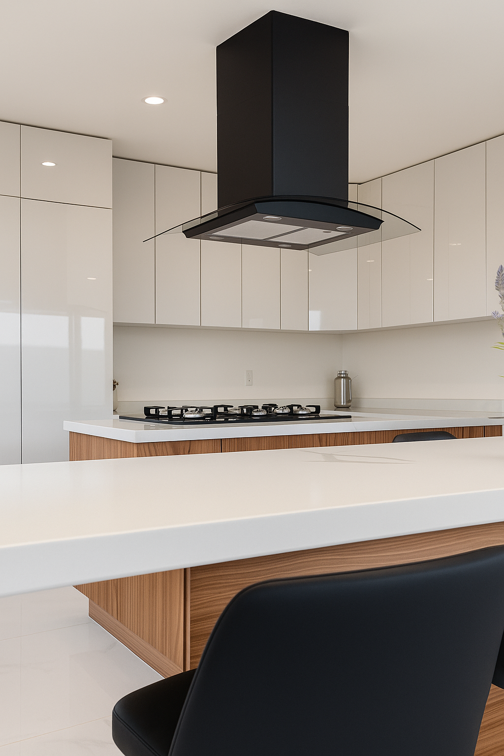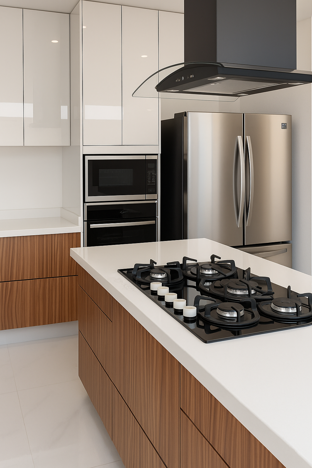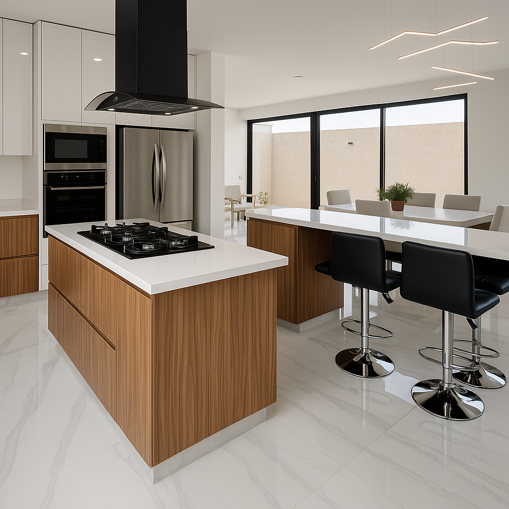 Cuenta con una cocina equipada con cubierta de cuarzo, iluminación decorativa, espacios amplios, acabados premium, detalles en madera natural, pisos de porcelanato de gran formato y una distribución ideal para familias que buscan vivir con clase y seguridad.