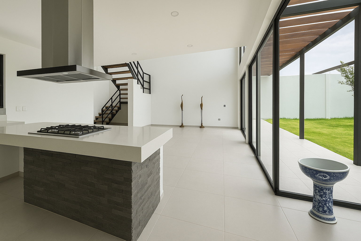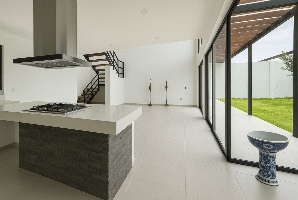 La propiedad cuenta con 3 amplias recámaras con baño completo, dos de ellas en planta baja con salida directa al jardín y una más en planta alta con terraza, vista panorámica y área de TV. La cocina está equipada con campana al centro y barra de granito o cuarzo, ideal para quienes valoran el diseño funcional y contemporáneo.